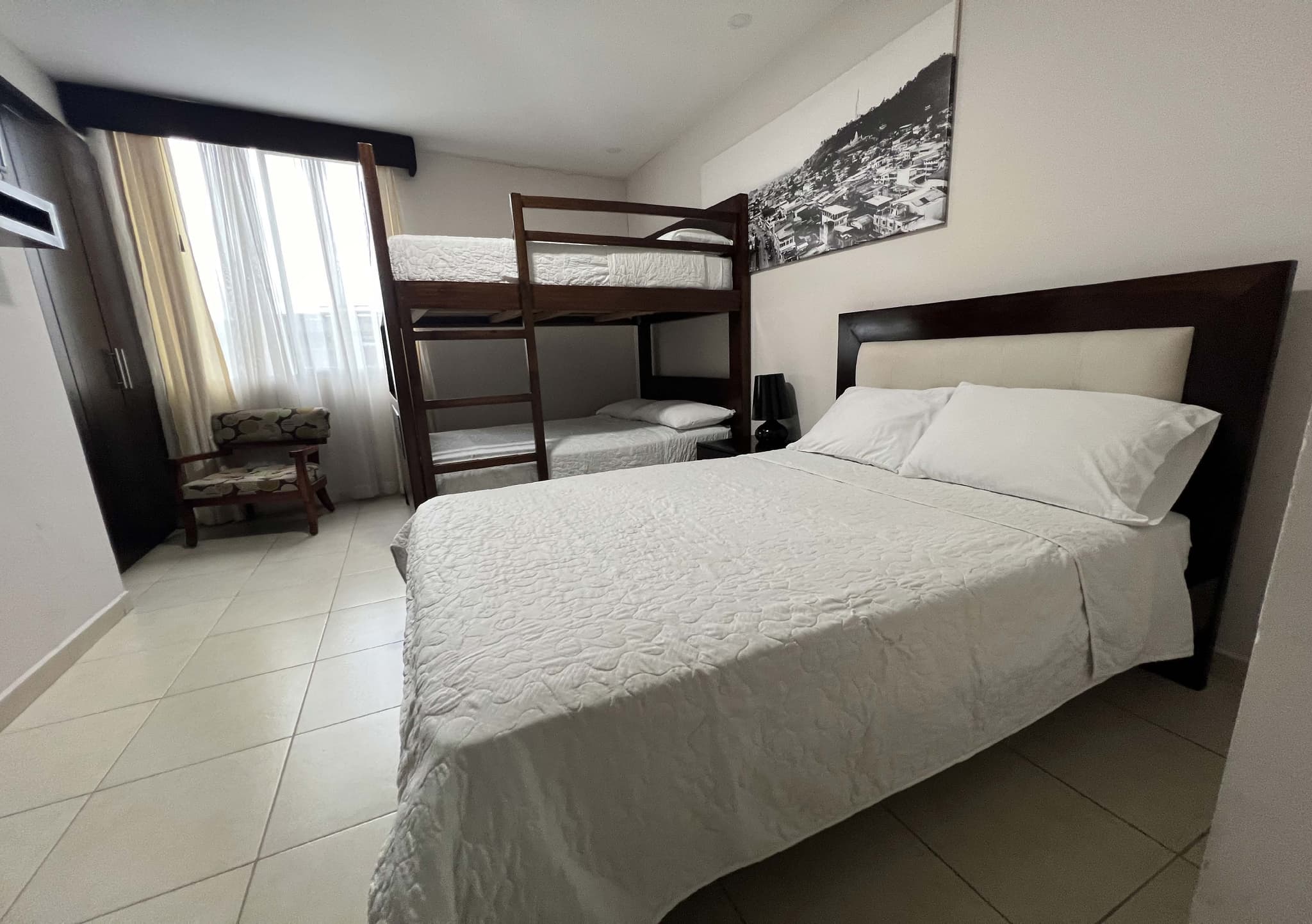 Habitación para disfrutar entre amigos y familia. Cuenta con una cama de 2 pzlas y 1 litera de dos camas de 2plzas, esta habitación dispone de ventanas. Incluye el desayuno y acceso al área de piscina, sauna y jacuzzi